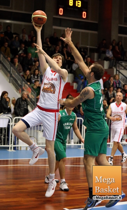 Ed a corollario di tutto, la partita d’esibizione fra il “TramonTeam” e la “Pizzeria La Tappa Old Stars”: partono sul 4-0 gli amici di Stefano e coach Mravic chiede subito di finire il match con tale punteggio, poi i suoi ragazzi si portano addirittura sul 22-10 grazie all’attivismo di Robba e Zurch e ad una “magia” di Cigui in semigancio rovesciato. Nel secondo periodo gli Old Stars recuperano grazie al solito inossidabile Massimo Guerra (27-23 a 5’40”), che con nove punti in pochi minuti ricuce lo strappo: poi è la volta di “Dacio” Bianchi che prende improvvisamente fuoco e sigla tre triple quasi di fila per il 36-35 a meno di tre minuti dall’intervallo lungo. C’è tempo anche per vedere il “sindaco” Manià sganciare due punti acrobatici contro i 208 cm di Mike Davis: il TramonTeam finisce il secondo periodo avanti 44-39.