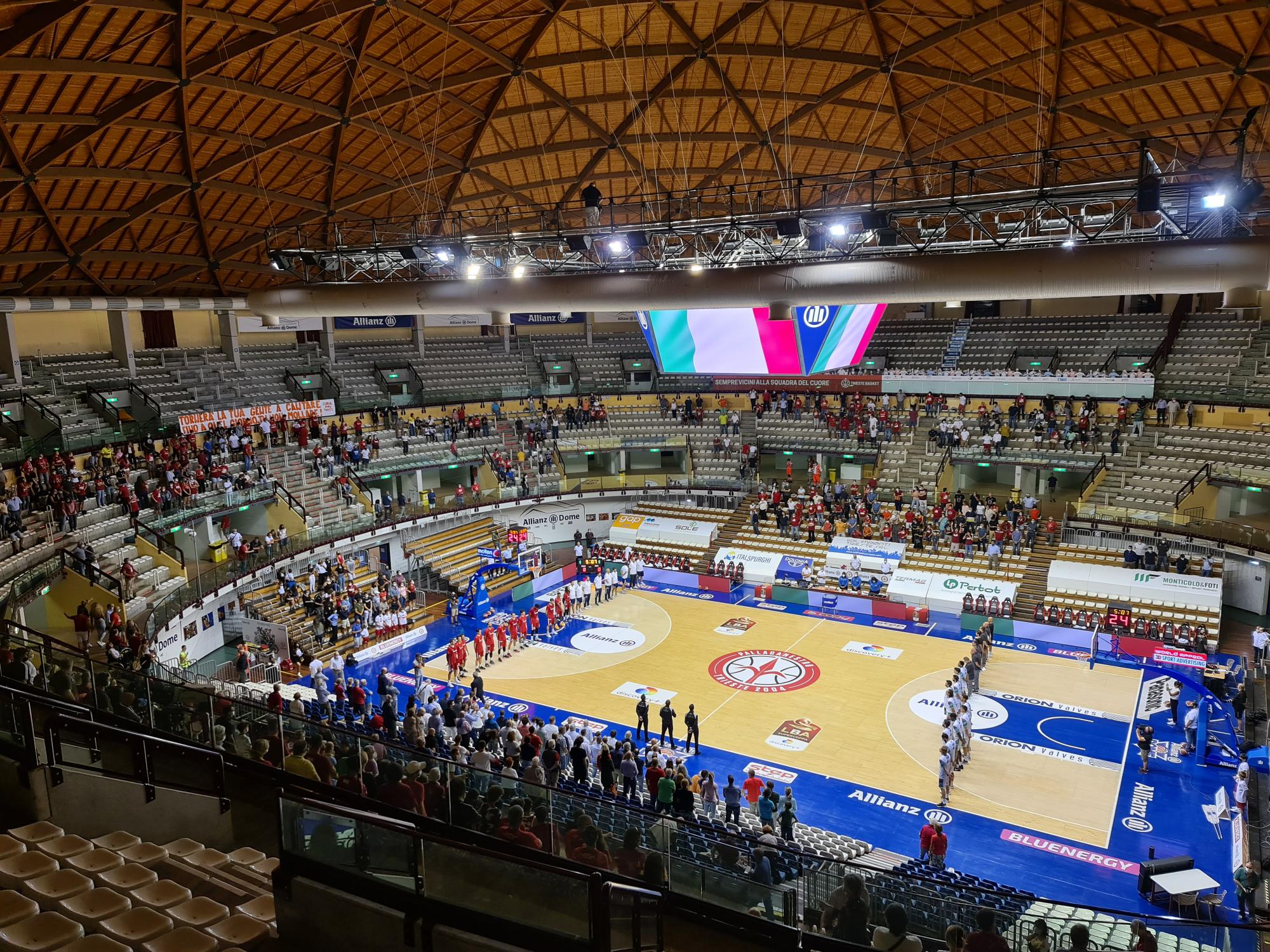 Applauso convinto della platea giuliana per l’ex Chris Wright, apprezzato a dir poco qualche stagione fa in maglia biancorossa. Alti ritmi dalle prime battute con Sagaba Konate subito sugli scudi con 4 punti consecutivi; Tortona sbaglia tanti tiri non contestati ma si trova a contatto, 4-3. Allunga l’Allianz sulle ali di una buona fase difensiva, parziale 5 a 0 chiuso da un canestro di Daum; l’ala forte tortonese fa tante cose intelligenti sul parquet, foriere di produzione offensiva, 12 punti e sorpasso ospite sul 11-12. Break tramortente della Bertram con un Daum infermabile (14 pt.); sul 11 a 16 coach Ciani chiama time out. Anche Filloy sente aria di casa (ex anche lui), colpisce nella “terra di nessuno” difensiva con regolarità; primo quarto chiuso sulla tripla allo scadere di Mascolo, 13-21. Grande personalità nella squadra di Ramondino, con le due fasi ben oliate: 16-26 sull’ennesimo canestro di Severini. Chris Wright, nonostante l’assenza di ritmo partita, trova sempre la soluzione più giusta, con precisione; nuovo time out chiamato da coach Ciani. Tante palle perse in casa Allianz anche in questa seconda partita di Supercoppa, vantaggio comodo degli ospiti sul 24-36. Gioca a memoria la Bertram, con spaziature magnifiche in fase offensiva e giocatori intelligenti a sfruttare le debolezze giuliane; +16 addirittura su tripla di Filloy, a 2 minuti dal termine della seconda frazione. Squadre all’intervallo con un sorprendente 29-51 sul tabellone.